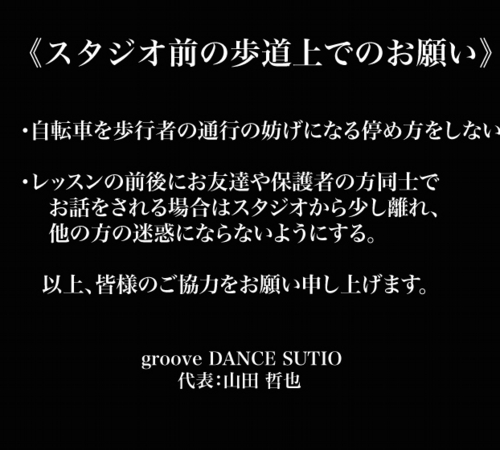 ・レッスンの前後にお友達や保護者の方同士でお話をされる場合はスタジオから少し離れ、他の方の迷惑にならないようにする。